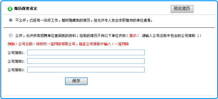 2)在打開的頁面中,選擇 不公開 ( 暫時(shí)隱藏我的簡(jiǎn)歷,但允許發(fā)出求職意向的單位查看! )后, 點(diǎn)擊"保存"按鈕即可. 如下圖所示: